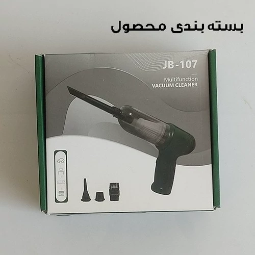 این جارو شارژی مدل JB-107 دارای باطری داخلی است که با توان 120 وات امکان استفاده را بر روی انواع خودرو و وسیله های نقلیه و تمیز کردن نقاط غیر قابل دسترس گوشه ی مبل ها و … را به ما می دهد و همچنین در صورت کثیف شدن فیلتر، به راحتی قابل شستشو است و نیازی به تعوض ندارد.جنس بدنه جارو از پلاستیک محکم ABS با طراحی زیبا و شیک است.بسته بندی این گجت ماشین شامل 4 عدد سری مختلف است که امکان جارو کردن تمام نقاط را به ما می دهد. . این دستگاه همانطور که از نامش پیداست، قابلیت دمندگی را نیز بر عهده دارد.جالب است بدانید که از این دستگاه بخاطر داشتن قابلیت دمندگی می‌توانید به عنوان یک وسیله برای باد کردن بادکنک یا تشک بادی یا حتی باد بزن زغال استفاده کنید .