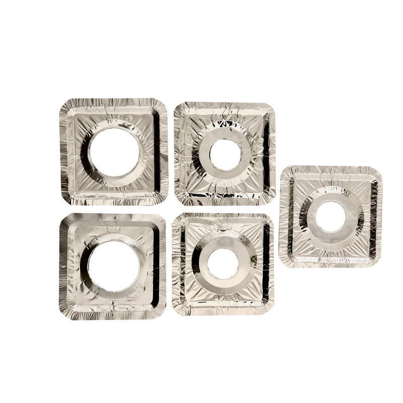 فویل آلومینیوم روگازی، شکل داده شده، مناسب جهت قرار گرفتن روی شعله گاز شیک و بادوام جهت حفظ پاکیزگی و زیبایی اجاق گاز بسیار ضخیم محتوی 5 عدد فویل رو گازی شامل 2 عدد سایز بزرگ با قطر 10 سانتی متر و 3 عدد سایز کوچک با قطر 6 سانتی متر دارای طول 22.5 سانتی متر، عرض 22.5 سانتی متر و ضخامت 60 میکرون