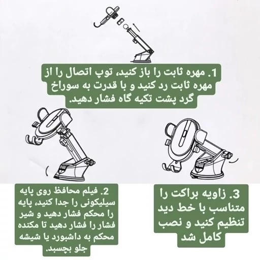 2. فیلم محافظ روی پایه سیلیکونی را جدا کنید، پایه را محکم فشار دهید و شیر فشار را فشار دهید تا مکنده محکم به داشبورد یا شیشه جلو بچسبد.